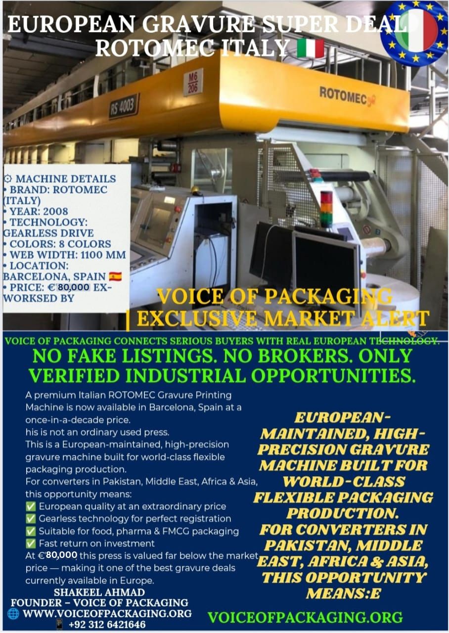 A premium Italian ROTOMEC Gravure Printing Machine is now available in Barcelona, Spain at a once-in-a-decade price.